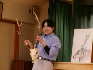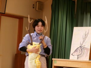 本物の、鹿のツノを触っていますよ